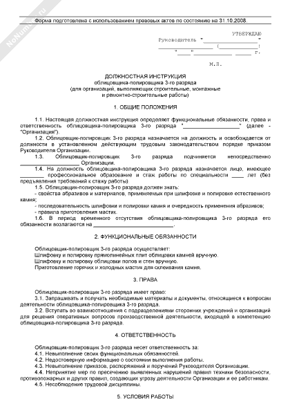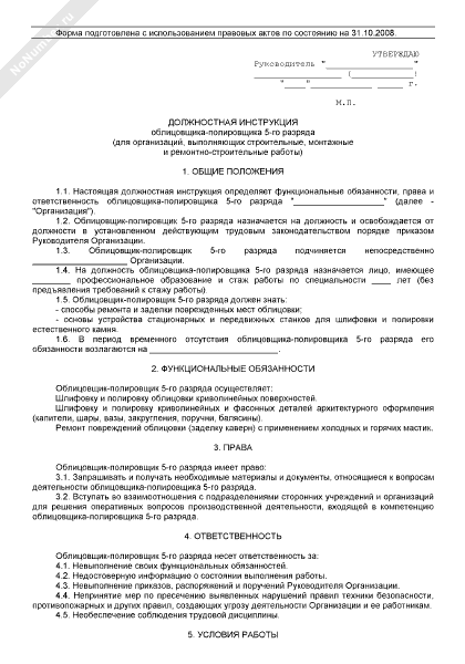 - 770Должностная инструкция облицовщика-полировщика 5-го разряда (для организаций, выполняющих строительные, монтажные и ремонтно-строительные работы)