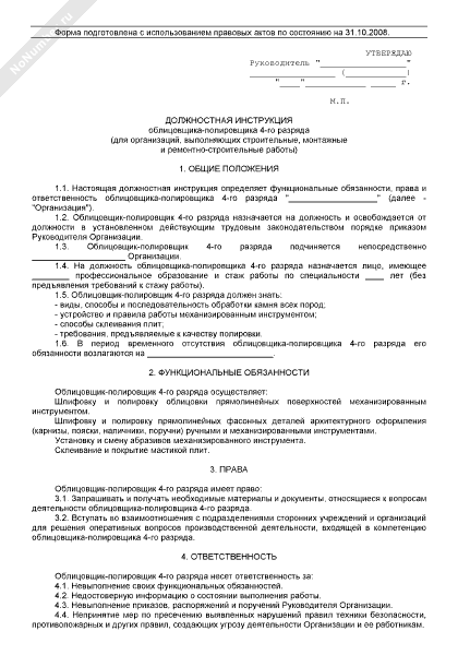 - 769Должностная инструкция облицовщика-полировщика 4-го разряда (для организаций, выполняющих строительные, монтажные и ремонтно-строительные работы)
