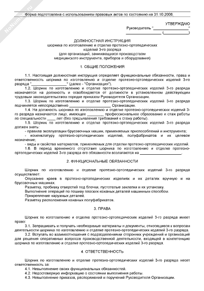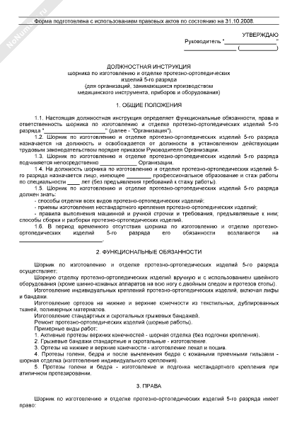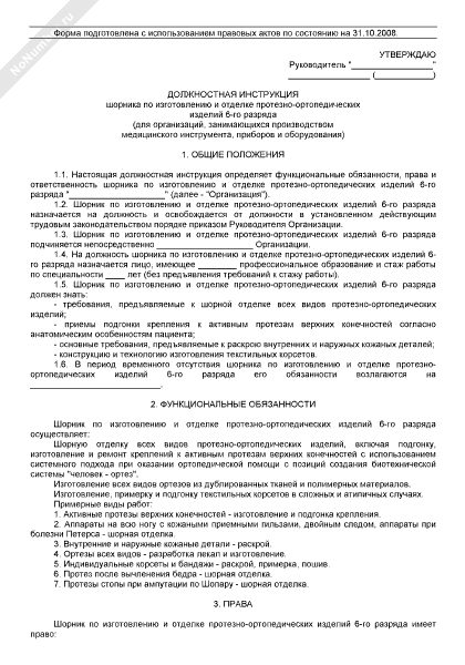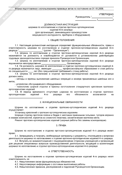 - 771Должностная инструкция шорника по изготовлению и отделке протезно-ортопедических изделий 3-го разряда (для организаций, занимающихся производством медицинского инструмента, приборов и оборудования)