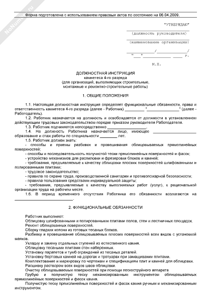- 921Должностная инструкция камнетеса 4-го разряда (для организаций, выполняющих строительные, монтажные и ремонтно-строительные работы)