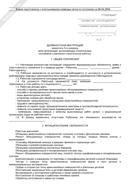 - 922Должностная инструкция камнетеса 5-го разряда (для организаций, выполняющих строительные, монтажные и ремонтно-строительные работы)