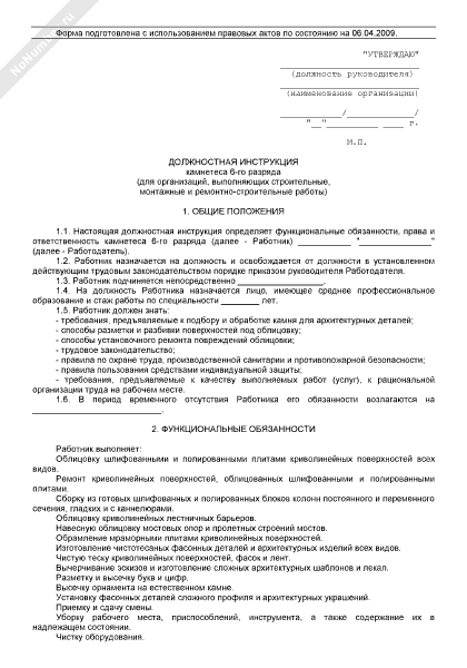- 923Должностная инструкция камнетеса 6-го разряда (для организаций, выполняющих строительные, монтажные и ремонтно-строительные работы)