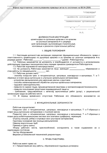 - 934Должностная инструкция кровельщика по рулонным кровлям и по кровлям из штучных материалов 4-го разряда (для организаций, выполняющих строительные, монтажные и ремонтно-строительные работы)