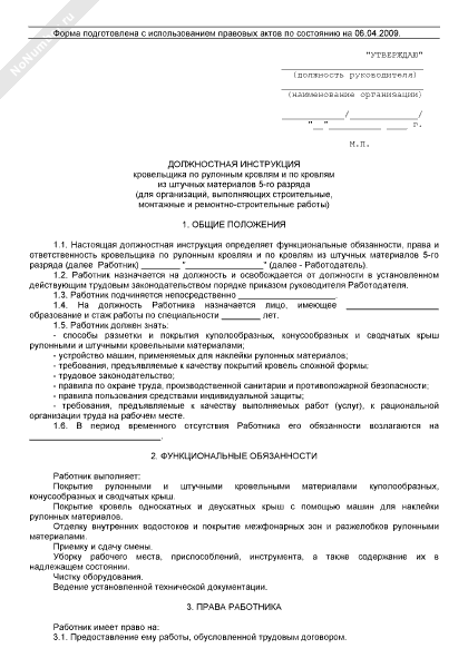 - 936Должностная инструкция кровельщика по рулонным кровлям и по кровлям из штучных материалов 5-го разряда (для организаций, выполняющих строительные, монтажные и ремонтно-строительные работы)