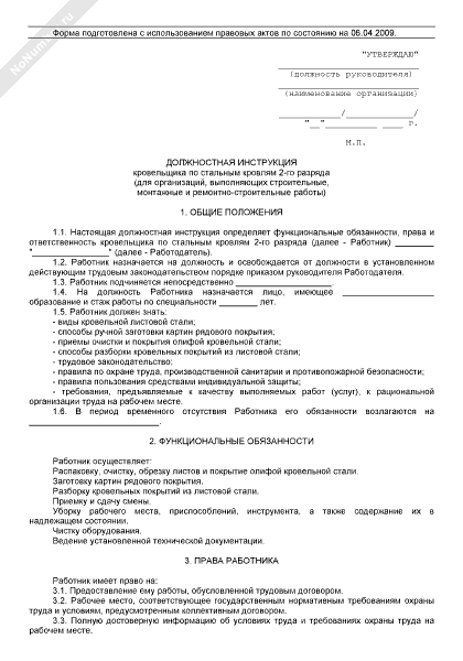 - 938Должностная инструкция кровельщика по стальным кровлям 2-го разряда (для организаций, выполняющих строительные, монтажные и ремонтно-строительные работы)