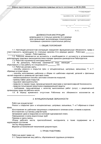- 935Должностная инструкция кровельщика по стальным кровлям 4-го разряда (для организаций, выполняющих строительные, монтажные и ремонтно-строительные работы)