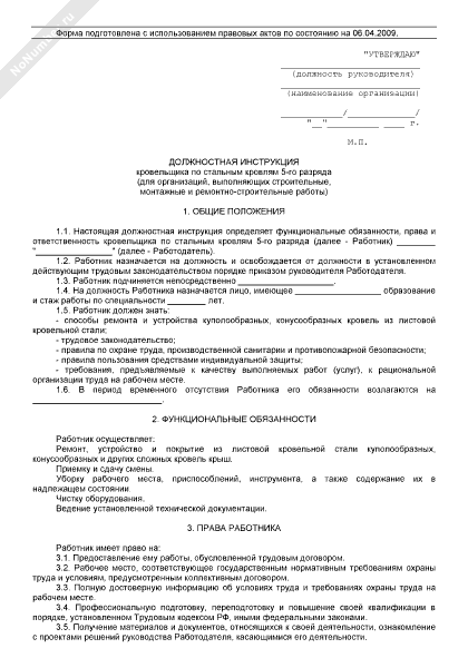 - 937Должностная инструкция кровельщика по стальным кровлям 5-го разряда (для организаций, выполняющих строительные, монтажные и ремонтно-строительные работы)