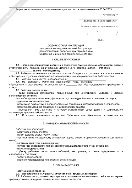 - 939Должностная инструкция лепщика архитектурных деталей 2-го разряда (для организаций, выполняющих строительные, монтажные и ремонтно-строительные работы)