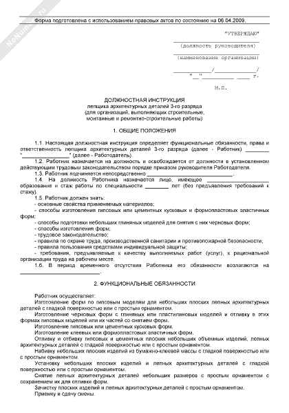 - 940Должностная инструкция лепщика архитектурных деталей 3-го разряда (для организаций, выполняющих строительные, монтажные и ремонтно-строительные работы)