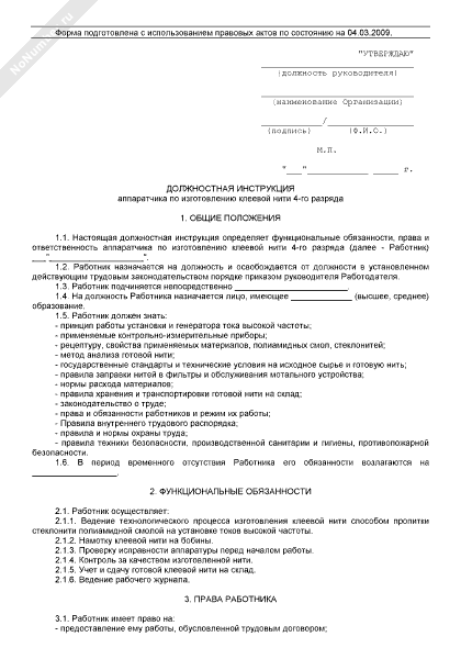 - 956Должностная инструкция аппаратчика по изготовлению клеевой нити 4-го разряда