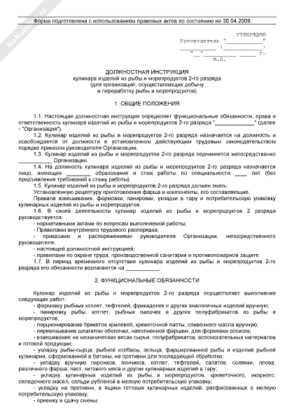 - 948Должностная инструкция кулинара изделий из рыбы и морепродуктов 2-го разряда (для организаций, осуществляющих добычу и переработку рыбы и морепродуктов)