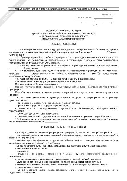 - 947Должностная инструкция кулинара изделий из рыбы и морепродуктов 1-го разряда (для организаций, осуществляющих добычу и переработку рыбы и морепродуктов)