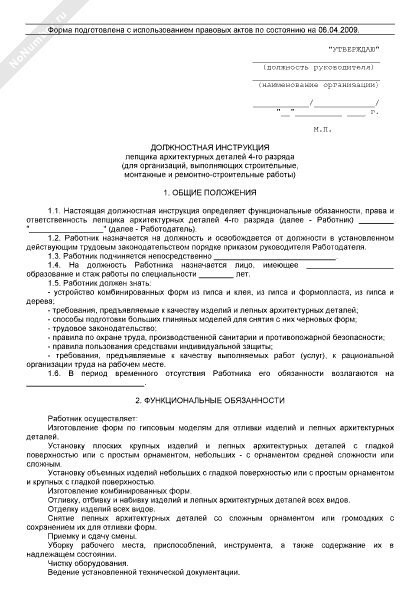 - 941Должностная инструкция лепщика архитектурных деталей 4-го разряда (для организаций, выполняющих строительные, монтажные и ремонтно-строительные работы)