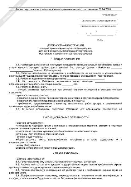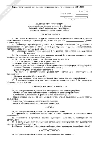 - 952Должностная инструкция модельщика архитектурных деталей 6-го разряда (для организаций, выполняющих строительные, монтажные и ремонтно-строительные работы)