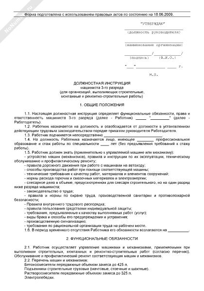 - 945Должностная инструкция машиниста 3-го разряда (для организаций, выполняющих строительные, монтажные и ремонтно-строительные работы)