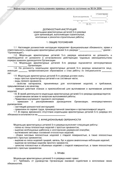 - 951Должностная инструкция модельщика архитектурных деталей 5-го разряда (для организаций, выполняющих строительные, монтажные и ремонтно-строительные работы)