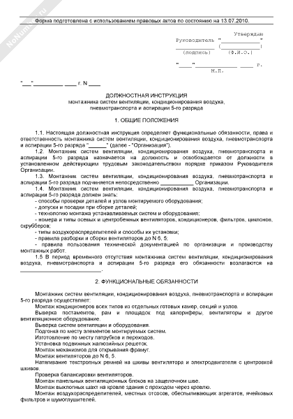 - 123Должностная инструкция монтажника систем вентиляции, кондиционирования воздуха, пневмотранспорта и аспирации 5-го разряда