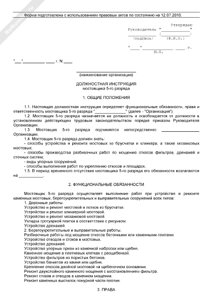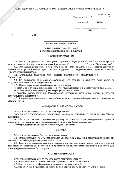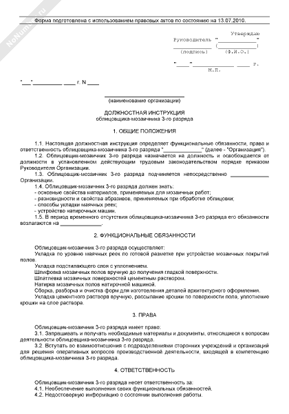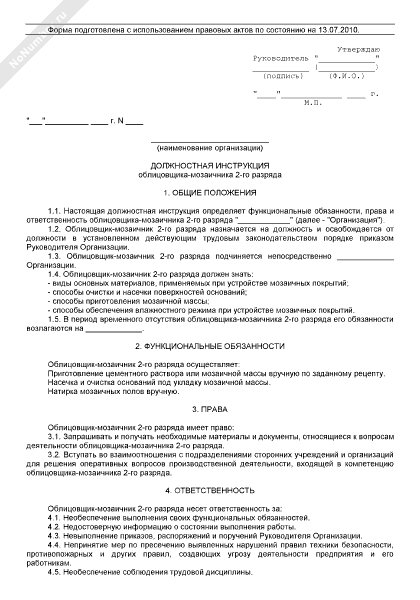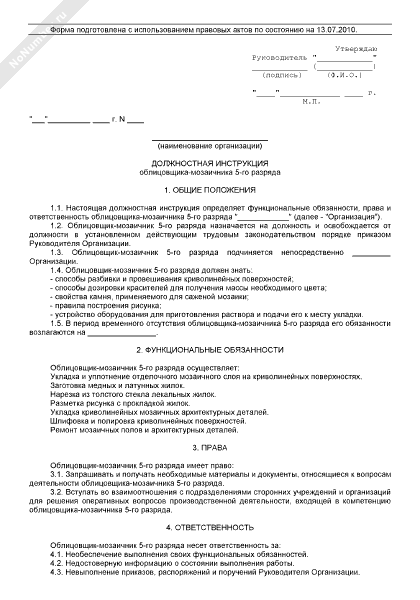 - 127Должностная инструкция облицовщика-мозаичника 5-го разряда (для организаций, выполняющих строительные, монтажные и ремонтно-строительные работы)