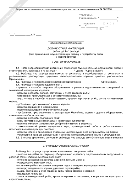 - 132Должностная инструкция рыбовода 4-го разряда (для организаций, осуществляющих добычу и переработку рыбы и морепродуктов)