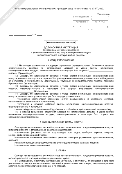 - 134Должностная инструкция слесаря по изготовлению деталей и узлов систем вентиляции, кондиционирования воздуха, пневмотранспорта и аспирации 5-го разряда