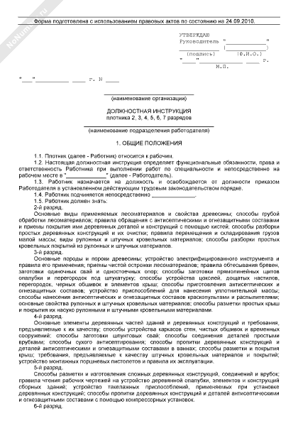Должностная инструкция плотника 2, 3, 4, 5, 6, 7 разрядов