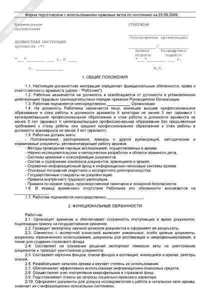Должностная инструкция архивиста (рекомендуемый образец заполнения)
