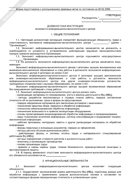 Должностная инструкция экономиста информационно-вычислительного центра (рекомендуемый образец заполнения)