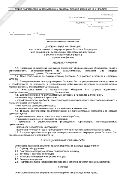 Должностная инструкция электромонтажника по аккумуляторным батареям 3-го разряда (рекомендуемый образец заполнения)
