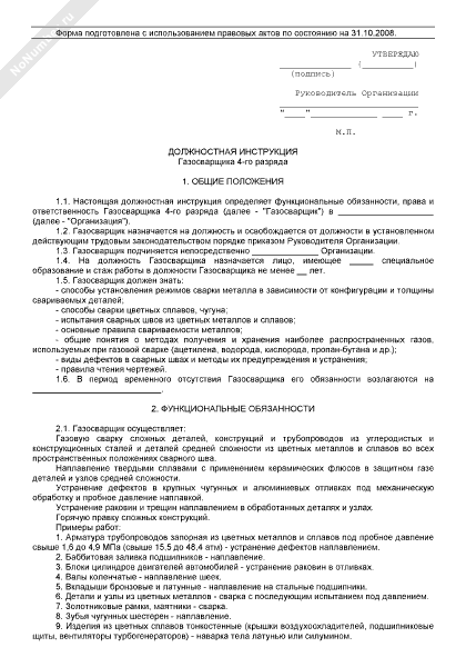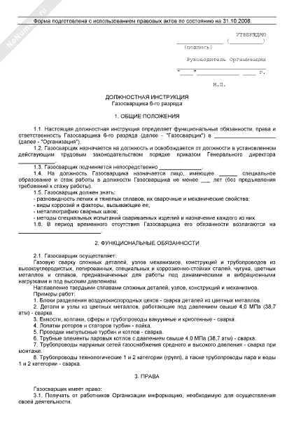 Должностная инструкция газосварщика 2-го разряда (рекомендуемый образец заполнения)