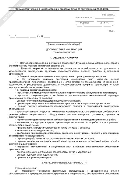 Должностная инструкция главного энергетика (рекомендуемый образец заполнения)