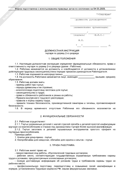 Должностная инструкция гнутаря по дереву 3-го разряда (рекомендуемый образец заполнения)