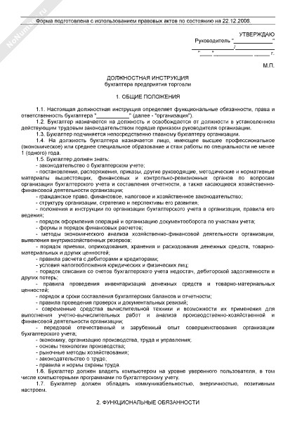 Должностная инструкция бухгалтера предприятия торговли