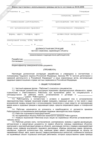 Должностная инструкция частного охранника, охраняющего объекты