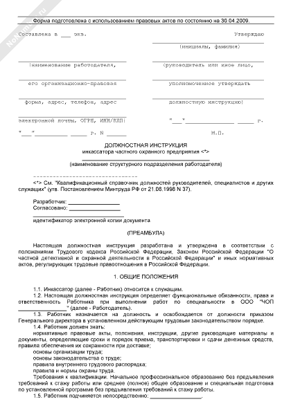 Должностная инструкция инкассатора частного охранного предприятия (рекомендуемый образец заполнения)