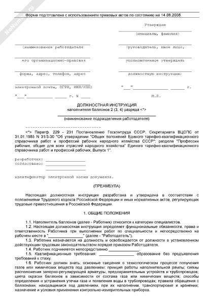 Должностная инструкция наполнителя баллонов 2-го (3, 4) разряда