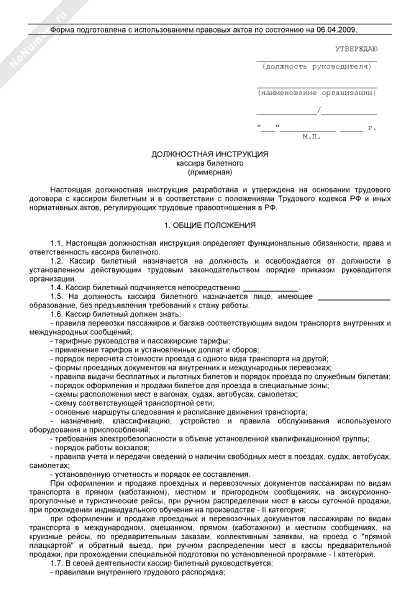 Должностная инструкция кассира (рекомендуемый образец заполнения)