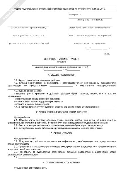 Должностная инструкция курьера (рекомендуемый образец заполнения)