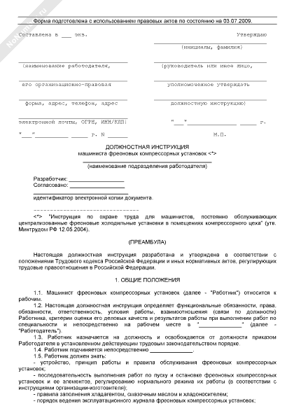 Должностная инструкция машиниста фреоновых компрессорных установок