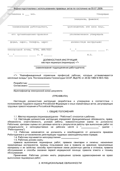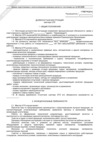 Должностная инструкция мастера службы (рекомендуемый образец заполнения)