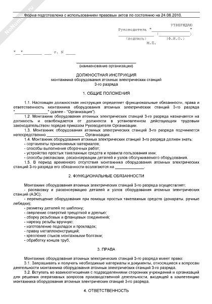 Должностная инструкция монтажника оборудования атомных электрических станций 3-го разряда (рекомендуемый образец заполнения)