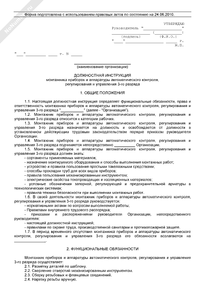 Должностная инструкция монтажника приборов и аппаратуры автоматического контроля, регулирования и управления 3-го разряда (рекомендуемый образец заполнения)