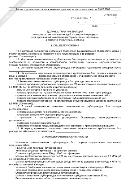 Должностная инструкция монтажника наружных трубопроводов 5-го разряда