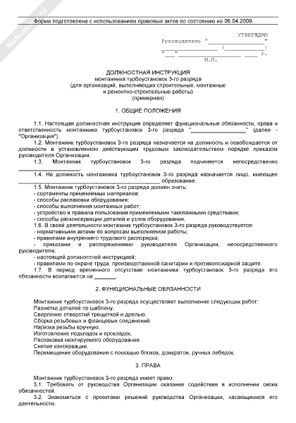 Должностная инструкция монтажника турбоустановок 3-го разряда (для организаций, выполняющих строительные, монтажные и ремонтно-строительные работы)