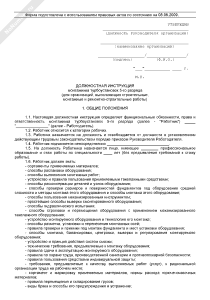 Должностная инструкция монтажника турбоустановок 5-го разряда (для организаций, выполняющих строительные, монтажные и ремонтно-строительные работы)