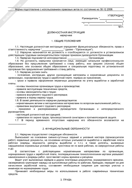 Должностная инструкция нарядчика (рекомендуемый образец заполнения)