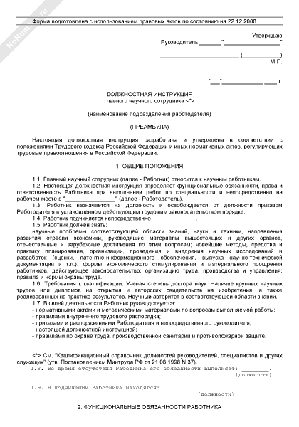 Должностная инструкция научного сотрудника (рекомендуемый образец заполнения)