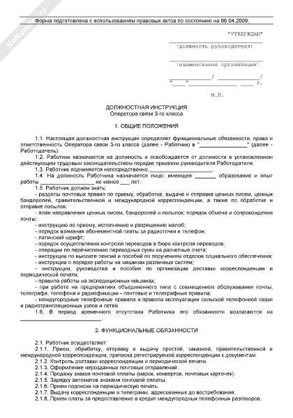 Должностная инструкция оператора связи 2-го (3, 4) разряда