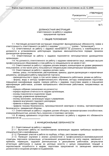 Должностная инструкция ответственного за работу с кадрами предприятия торговли (рекомендуемый образец заполнения)