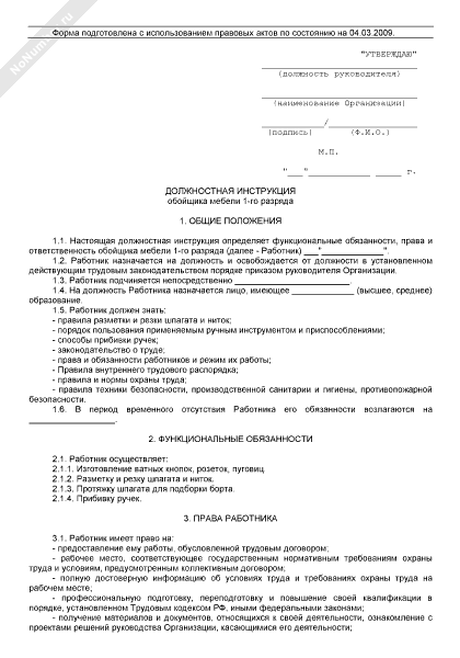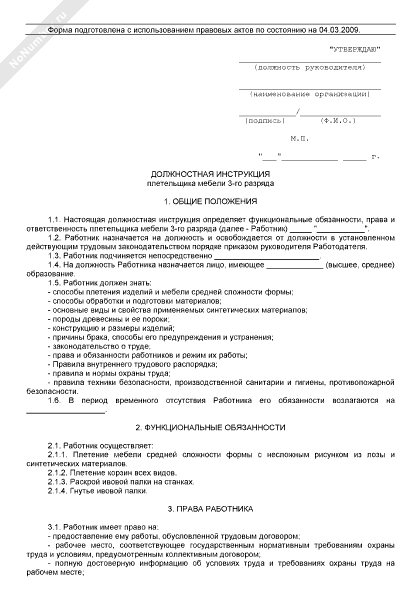 Должностная инструкция плетельщика мебели 2-го разряда (рекомендуемый образец заполнения)