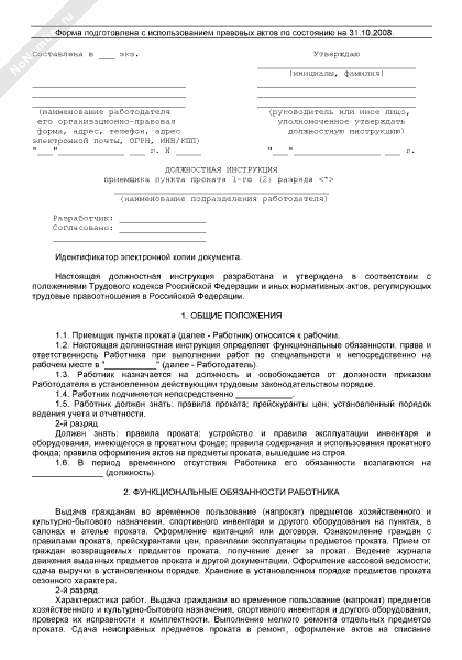 Должностная инструкция приемщика пункта проката 1-го (2) разряда